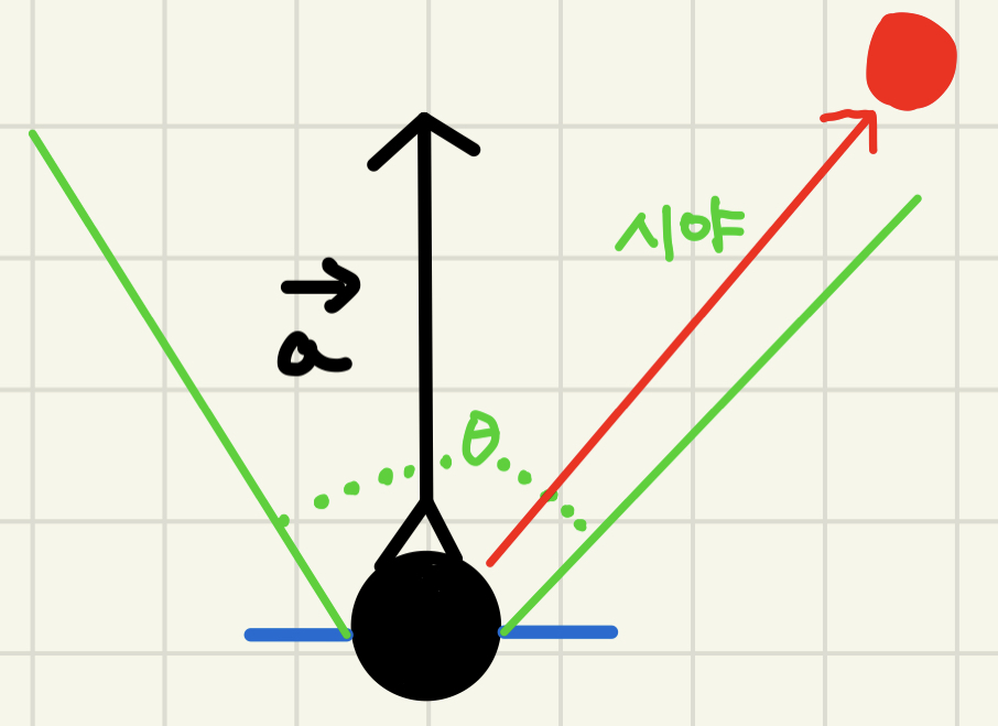 - 플레이어의 시야가 θ라고 가정하면 방향벡터 a (forward 벡터) 양쪽으로