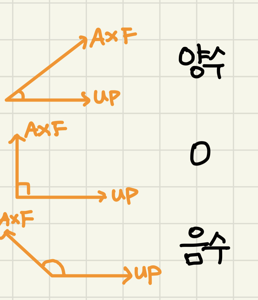 A와 F를 외적해서 나온 벡터와 Up과의 내적