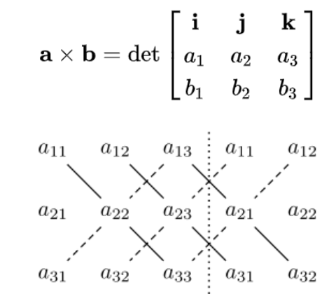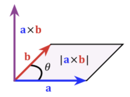 위에 그림에서 a, b 두 벡터의 외적은 파란색 벡터라고 할 수 있다.