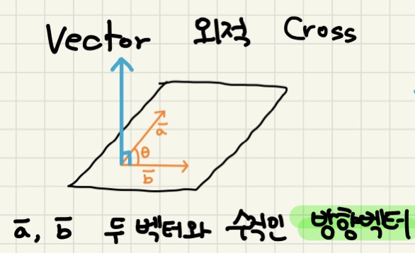 외적은 두 벡타 각각 수직인 또 다른 벡터를 말한다.